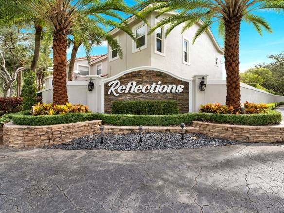 Beautiful townhouse completed remodel with screened-in front porch and bonus screened back patio, surrounded by lush landscaping for complete privacy. This 3 bedroom + loft, 2 and a half bathrooms home feature a large kitchen with new custom wood cabinets, unique leathered finish granite countertops & copper accents. Brand new roof and water heater, hurricane accordion shutters (all just replaced in 2021), A/C (2018), brand new appliances, and newer gutters & downspouts. Master bedroom on the first floor. Homeowners have exclusive access to both community pools as well as resort-style amenities. Located in the gated Reflections community within Mission Bay at Boca Raton. Mission bay offers a waterfront resort-style pool, fitness center, tennis courts, and more.