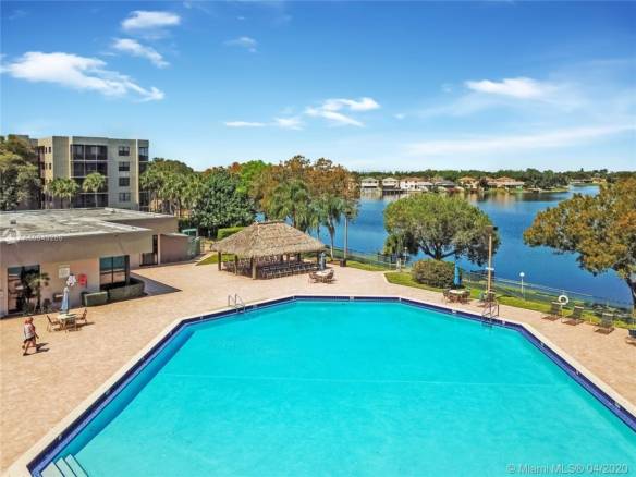 Spacious 2 bedroom and 2 bathrooms corner unit in quiet desirable 55+ com unity. Gorgeous view of the lake. Apartment in great condition recently painted tile and laminate floors throughout, plenty of closet space, washer & dryer, additional storage room. Unit located very close to the elevator for great convenience. This community offers a 24 hr guarded gate, bus service, theater, billiards, fitness room, outdoor heated pool, Jacuzzi, sauna, tennis, racquetball & shuffleboard courts, jogging path and many more. Maintenance includes basic cable, water, and access to all amenities.