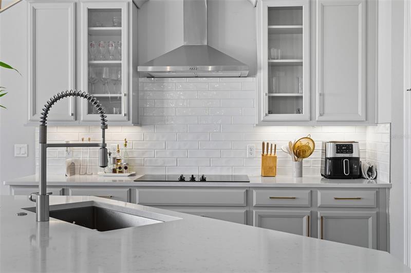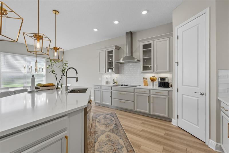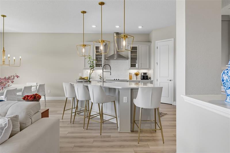 This residence is loaded with upgrades: luxury vinyl flooring throughout, elegant quartz countertops, soft-close cabinetry, designer glass-front cabinets, and beautiful under-cabinet lighting that adds charm and sophistication to the kitchen.