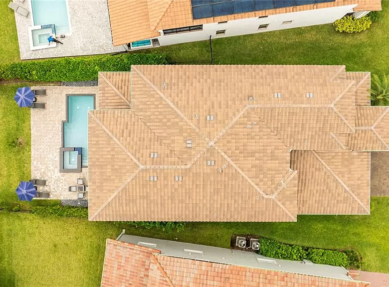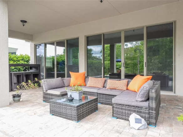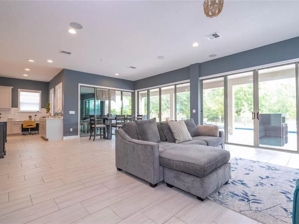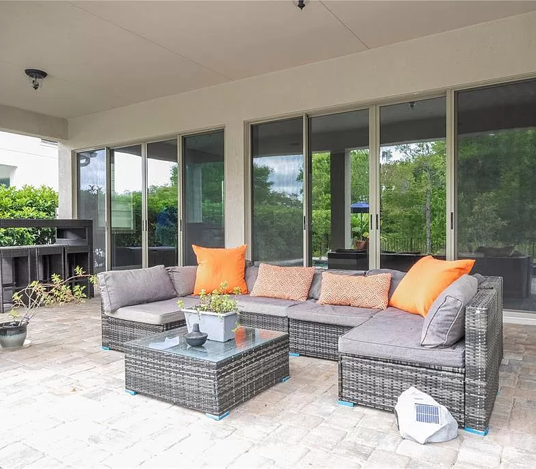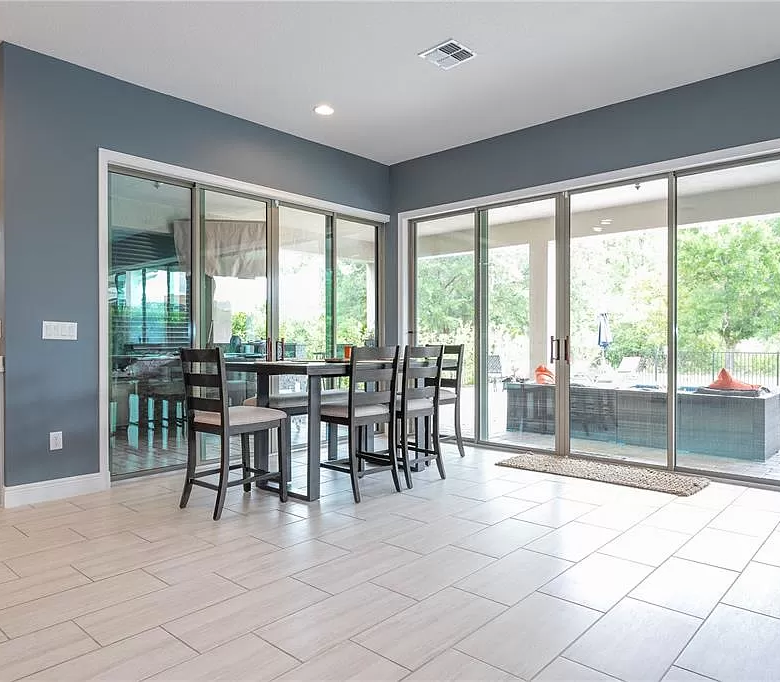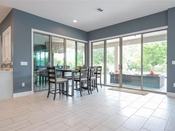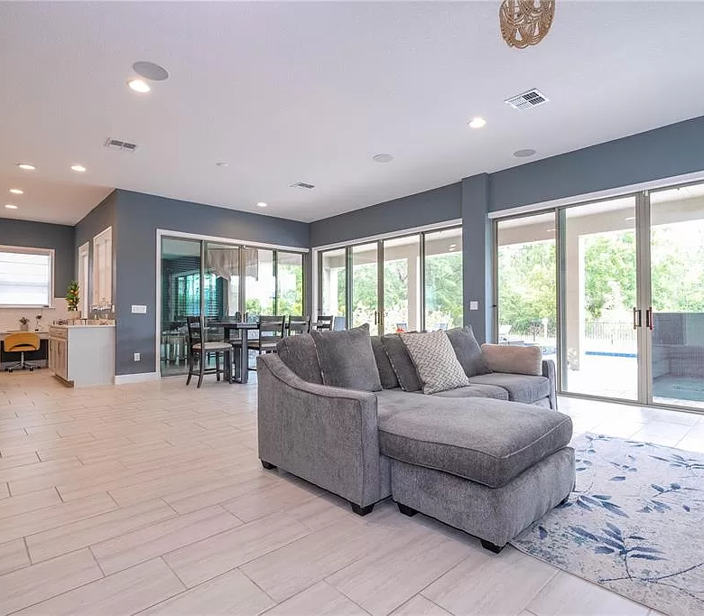 The seamless transition from the living and dining areas to the pool deck through multiple sliding doors increases the feeling of space and creates an ideal environment for entertaining guests or simply relaxing with your loved ones.